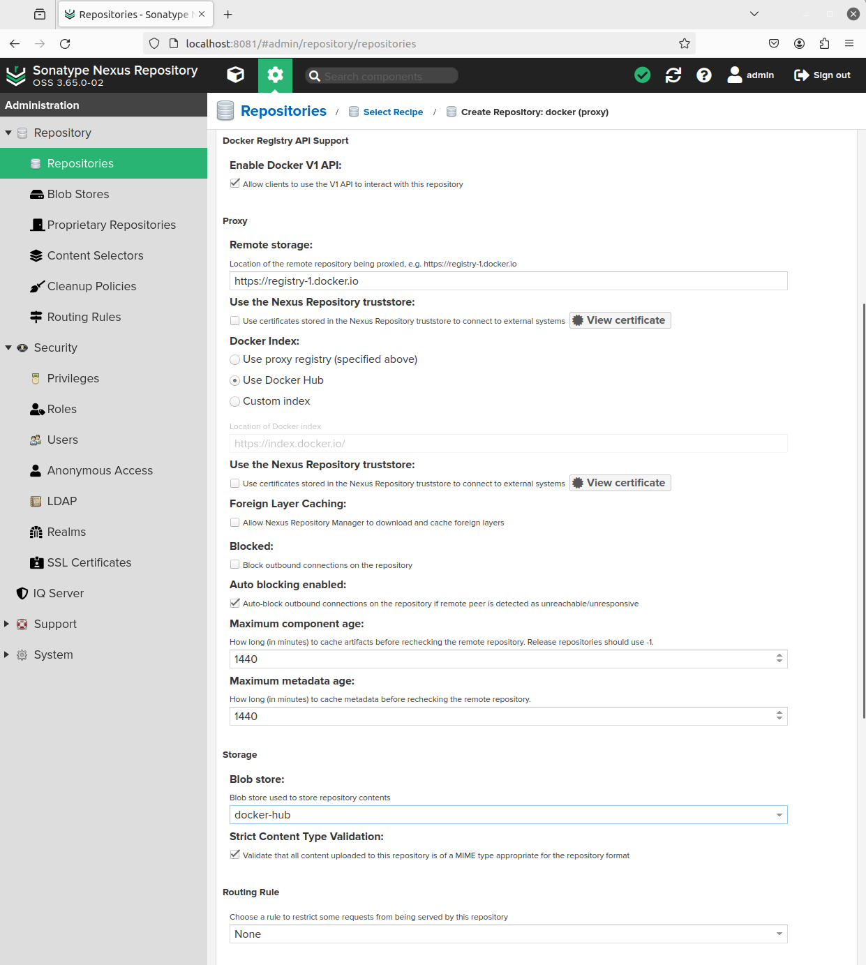 Blob Stores에서 docker-hosted, docker-hub를 생성한다.