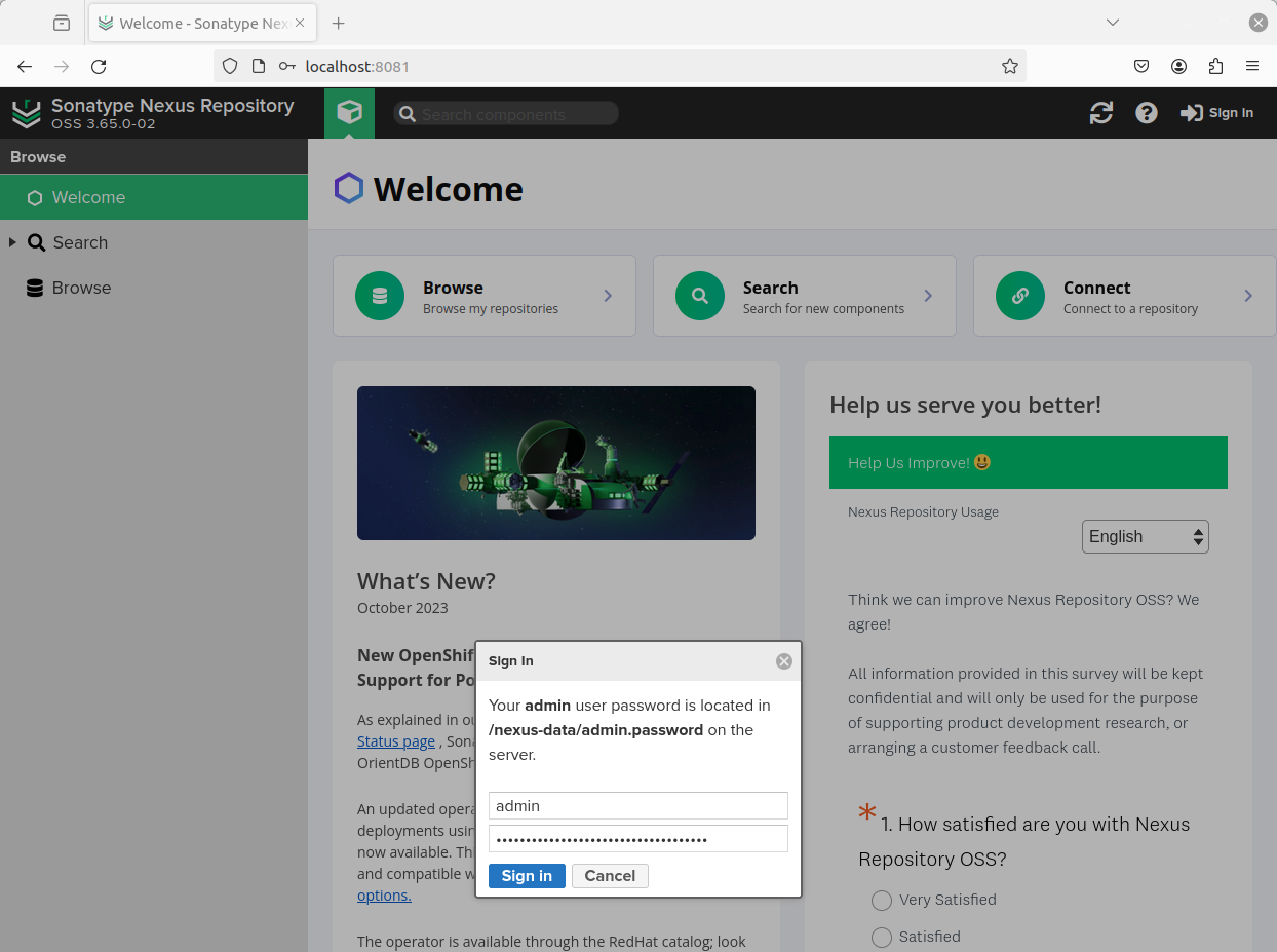 admin 비밀번호는 /nexus-data/admin.password 에서 확인한다.