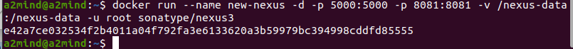 docker run --name nexus -d -p 5000:5000 -p 8081:8081 -v /nexus-data:/nexus-data -u root sonatype/nexus3