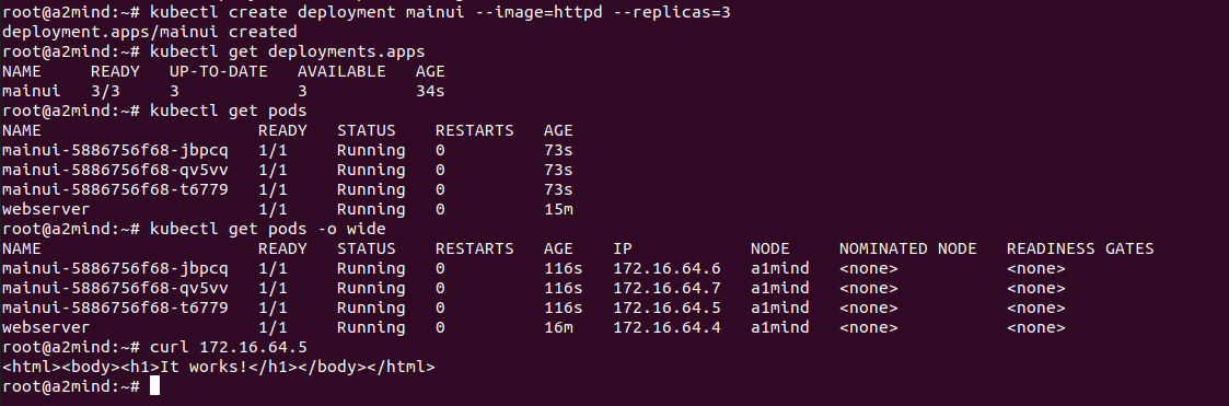 kubectl create deployment mainui --image:httpd --replicas=3