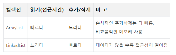 - ArrayList도 배열을 사용하기 때문에 배열의 장-단점을 모두 지니고 있음