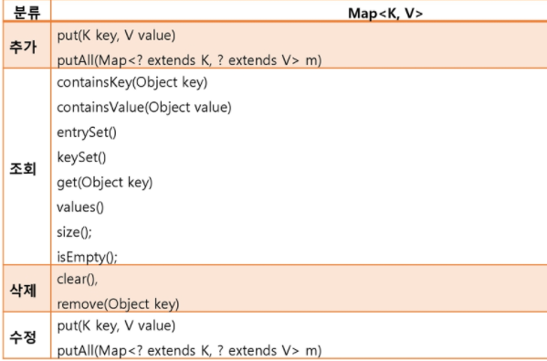 - Map : key와 Value의 쌍으로 데이터를 관리하는 집합. 순서는 없고 key의 중복 불가. value는 중복가능하다.