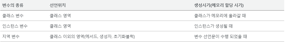 - 변수의 생성 : 객체가 만들어질 때 객체 별로 생성됨