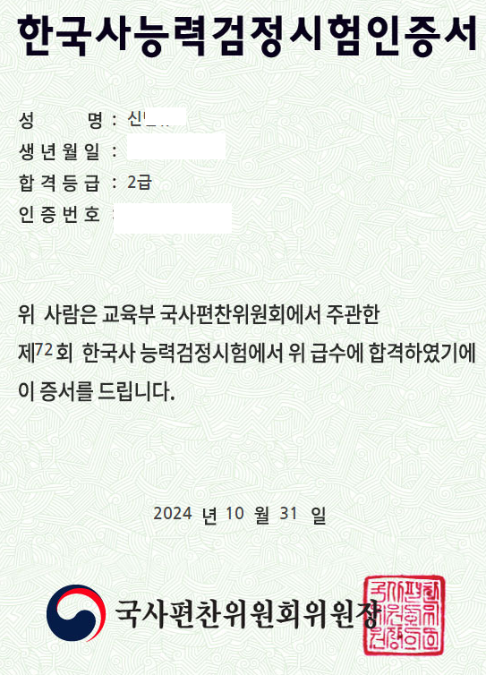 한국사능력검정 시험을 치른 이유는 흔히 기업 입사에 필요한 자격증을 따기 위함은 아니다. 어렸을 때부터 한국사에 큰 관심이 없었던 것이 계기가 되었다. 암기 과목에 약하다는 이유로 한국사를 깊이 공부해본 적이 전무했기에, 이번 기회를 통해 한국사를 제대로 알아보고자 시험을 준비하게 되었다.