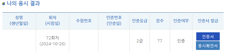 선지가 수능처럼 9개에서 11개로 배분이 되던데 이 사실을 시험 전에 알았다면 1급을 할 수도 있었을 것 같다. 소거법으로 헷갈리는 것을 어떤 번호로 찍어야될지 경우의 수를 찾아보면 좋았을 것 같다. 합격만을 목표로 했지만 77점이라는 애매한 점수를 받으니까 1급을 못 받았다는 것에 아쉽지만 1급을 받았다고 해서 특별한게 있는 것은 아니니까 괜찮다!