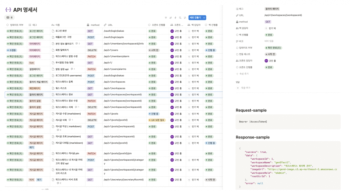 반복되는 API 명세 형식을 템플릿으로 만들어 일관성 있는 문서화를 할 수 있습니다. 데이터베이스 기능을 이용하면 API 목록을 표 형태로 관리하거나, 필터·정렬이 가능합니다.