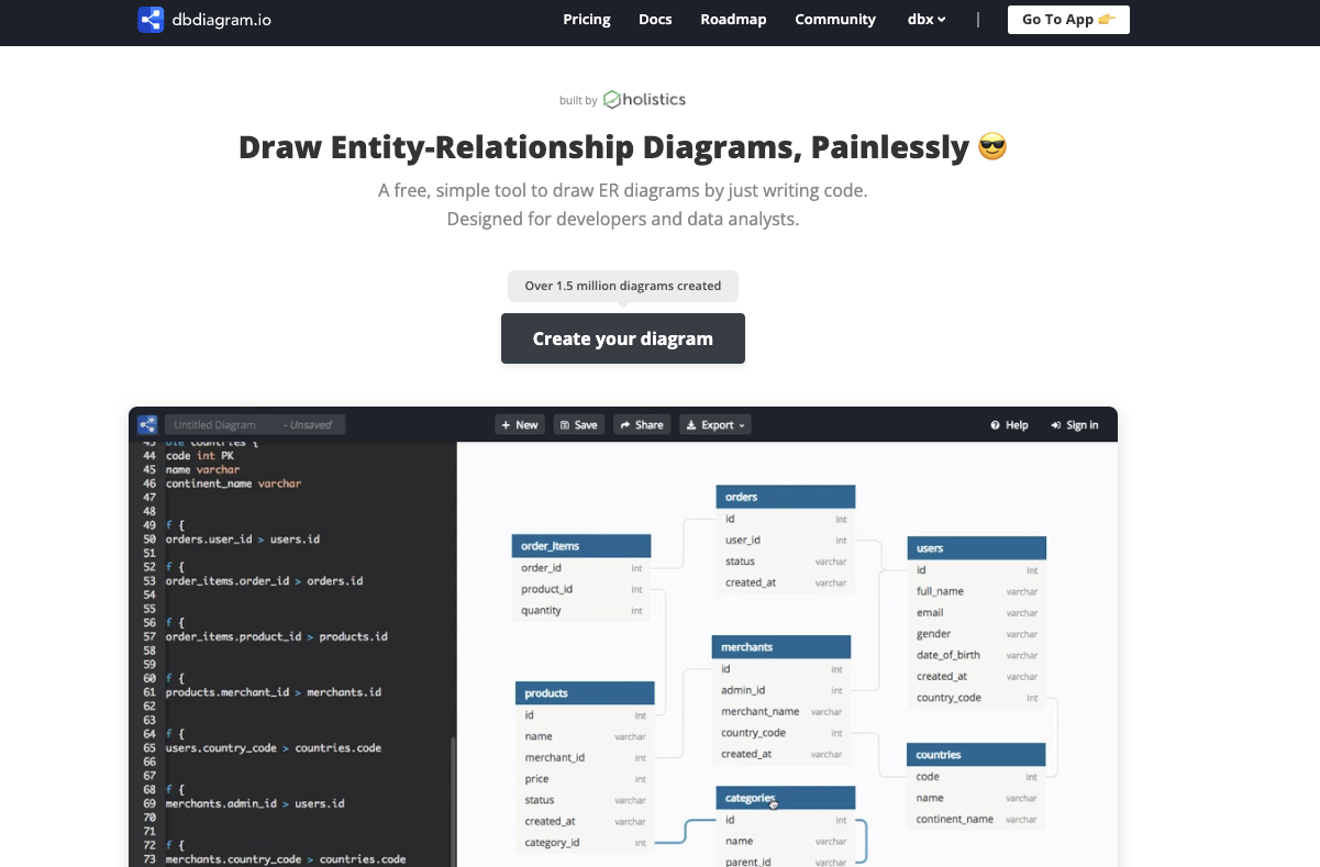 처음 프로젝트에서 ERD를 그려야 했을 때, dbdiagram.io를 사용해봤어요. 이 툴의 가장 큰 특징은 마우스로 박스를 끌어다 놓는 방식이 아니라, 쿼리 문법으로 ERD를 그릴 수 있다는 점입니다. 예전에 SQL 쿼리 실습을 조금 해본 덕분에, 오히려 이런 방식이 더 편하게 느껴졌고, 실제로 테이블 구조를 쿼리로 직접 써보니까 SQL에 더 익숙해지는 효과도 있었습니다.