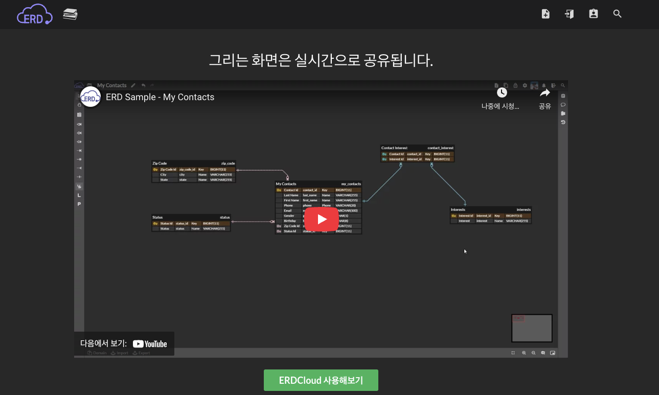 복잡한 설치나 어려운 코딩 없이, 그림 그리듯이 데이터베이스 구조를 만들고 팀원과 실시간으로 협업할 수 있다는 점이 ERDCloud의 가장 큰 매력이라고 생각합니다.