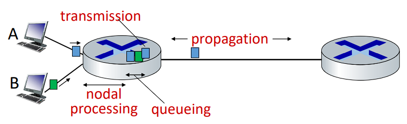 - 패킷 헤더를 검사하고 목적지를 결정하는 라우팅 과정, 오류 검사 및 수정, 패킷 큐에서 대기하는 동안의 대기 시간 등이 포함한다.