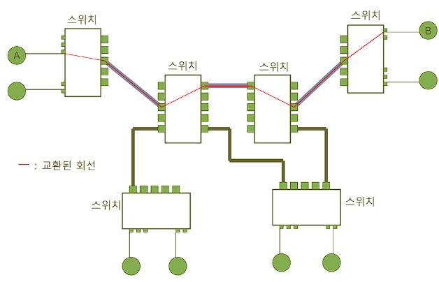 - No store-and-forward (저장 및 전달 없음): 회선 스위칭에서는 데이터가 전달되기 전에 저장되거나 버퍼링되지 않는다. 데이터는 실시간으로 회선을 통해 전송된다. 이것은 데이터가 전달되는 동안 지연이 최소화되고, 전송이 즉시 시작된다는 것을 의미한다.