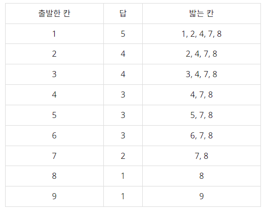 점프대가 없는 1번 칸의 답은 바로 다음 2번 칸의 답에 1을 더한 것과 같다. 높이 1의 점프대가 있는 2번 칸의 답은 한 칸을 건너뛴 4번 칸의 답에 1을 더한 것과 같다. 다른 칸들도 같은 방식으로 답을 구할 수 있다. 특히 도로를 벗어나게 되는 8번 칸과 9번 칸의 답은 1(각각 밟는 칸이 8번, 9번뿐이다) 임을 확인하자.