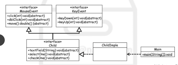 - MouseEvent와 KeyEvent를 상속받는 Child interface를 구현받았기 때문에 MouseEvent, KeyEvent, Child에 있는 메서드들 사용가능