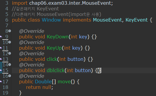 - KeyEvent라는 interface와 MouseEvent(다른 패키지에 있음)라는 interface