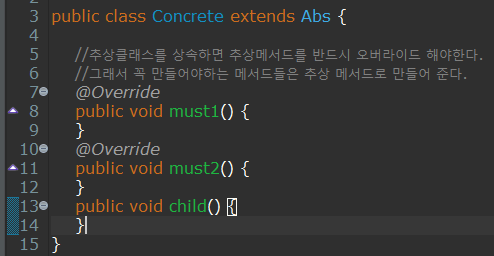 - 7 ~ 12 : 추상클래스를 상속하면 추상메서드를 반드시 오버라이드 해야한다