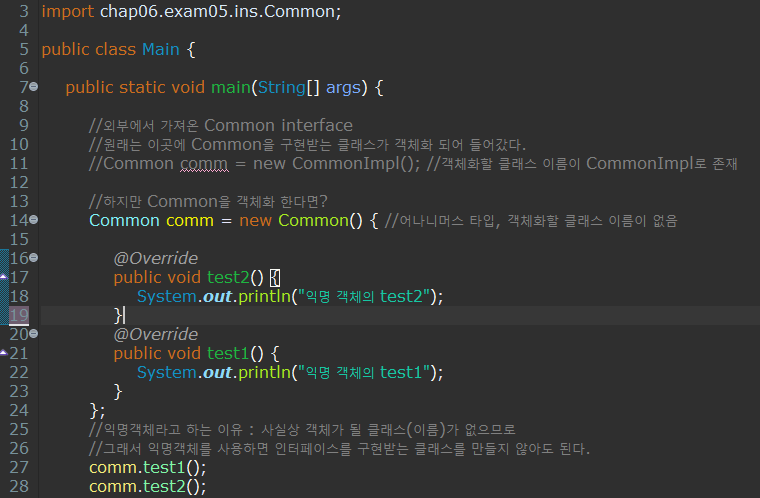 ○ 이 것을 익명객체라고 하며 익명객체를 사용하면 인터페이스를 구현받는 클래스를 만들지 않아도 된다