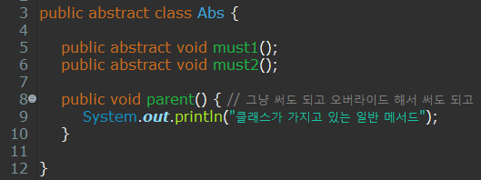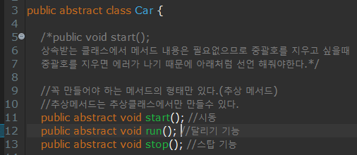 - 이 때 그냥 지우기만 하면 오류가 나므로 추상메서드라는 의미로 abstract를 넣어준다.