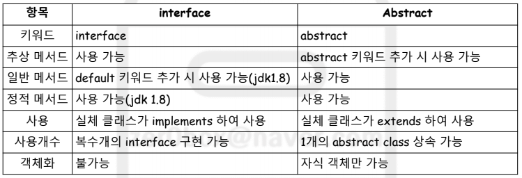 - interface는 여러개의 interface 구현이 가능하지만 추상클래스는 1개만 상속받아 사용할 수 있다.