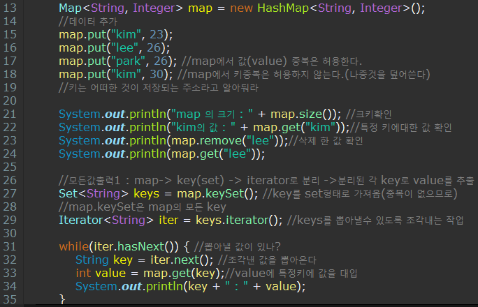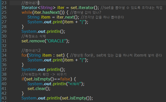 - 24 : 향상된 for문을 이용하여 set에 있는 값을 하나씩 item에 넣는 작업이다. 이 방법을 많이쓴다.