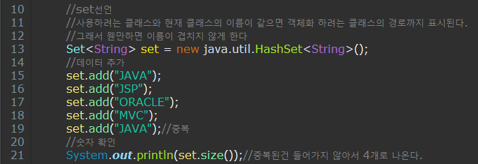 - 19 : Set은 중복을 허용하지 않으므로 이 값은 들어가지 않는다