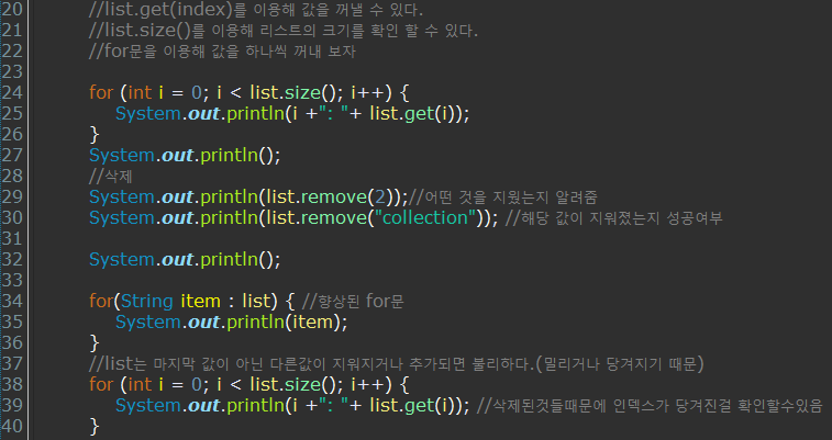 - 38 , 39 : for문을 통해 남아있는 list의 값을 출력하는데 삭제된 것들 때문에 인덱스가 당겨진걸 확인할 수 있다