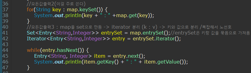 - 37, 38 : 향상된 for문을 이용해 모든 값을 출력하는 법, 제일 많이 사용한다