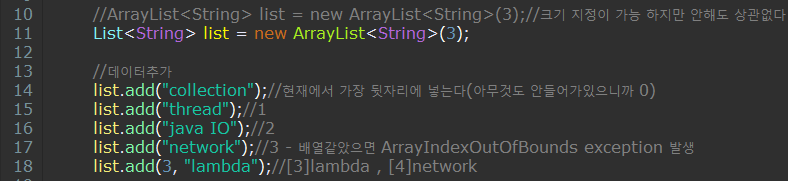 - 17 : list의 크기를 3으로 지정해줬지만 그냥 값을 넣어도 에러가 발생하지 않는다. 배열이었으면 ArrayIndexOutOfBounds exception 발생