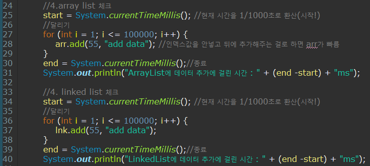 - 28 , 37의 인덱스 값을 빼고 그냥 뒤에 추가해주는 방법의 출력값으로 ArrayList가 더 빠른것을 알수 있다.