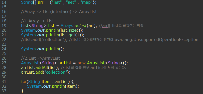 - 28 : Array를 List로 만든 list의 값을 전부 arrList에 부어 넣는다.