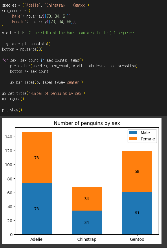 p = ax.bar(species, sex_count, width, label=sex, bottom=bottom)