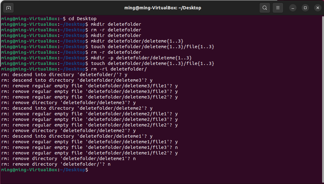 rm -ri (삭제하고 싶은 폴더명) # 대화형으로 세부적으로 삭제를 할 수 있다.