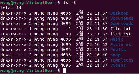 위 명령을 실행하면 현재 있는 폴더의 파일과 폴더에 대해 자세한 리스틑업이 출력된다.