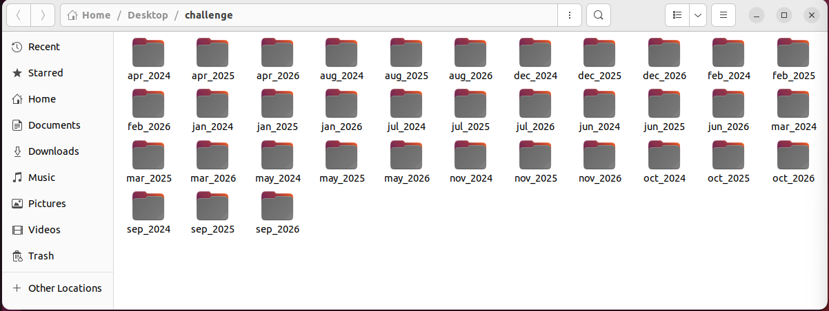 challenge라는 폴더를 만들고 그 안에 폴더명이 'jan_2024', 'feb_2024', ... 'nov_2026'이렇게 36개의 폴더를 한번에 만들고 싶다면 어떻게 할까?