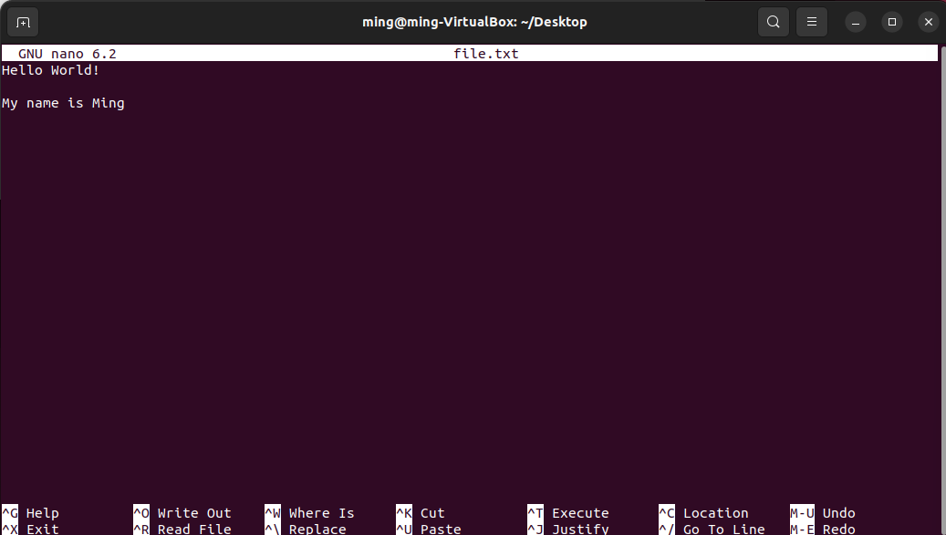 위 명령어로 file.txt 파일을 만들어 주고 그 안에 "Hello World"라는 문장을 넣었다.