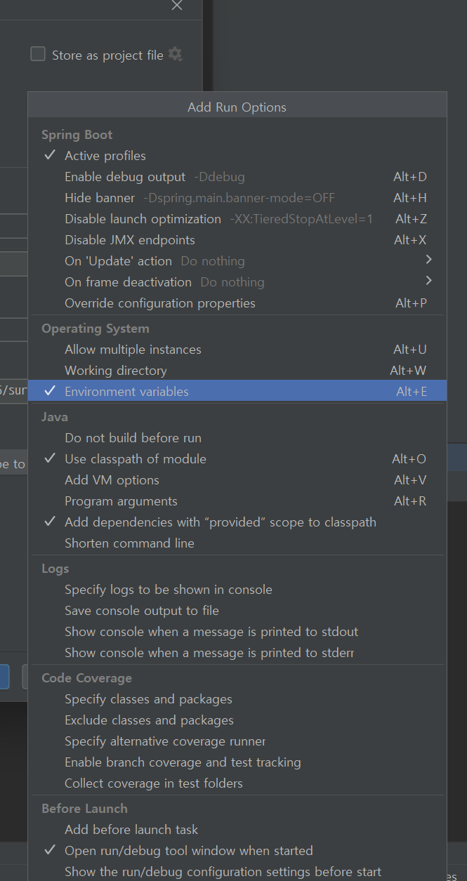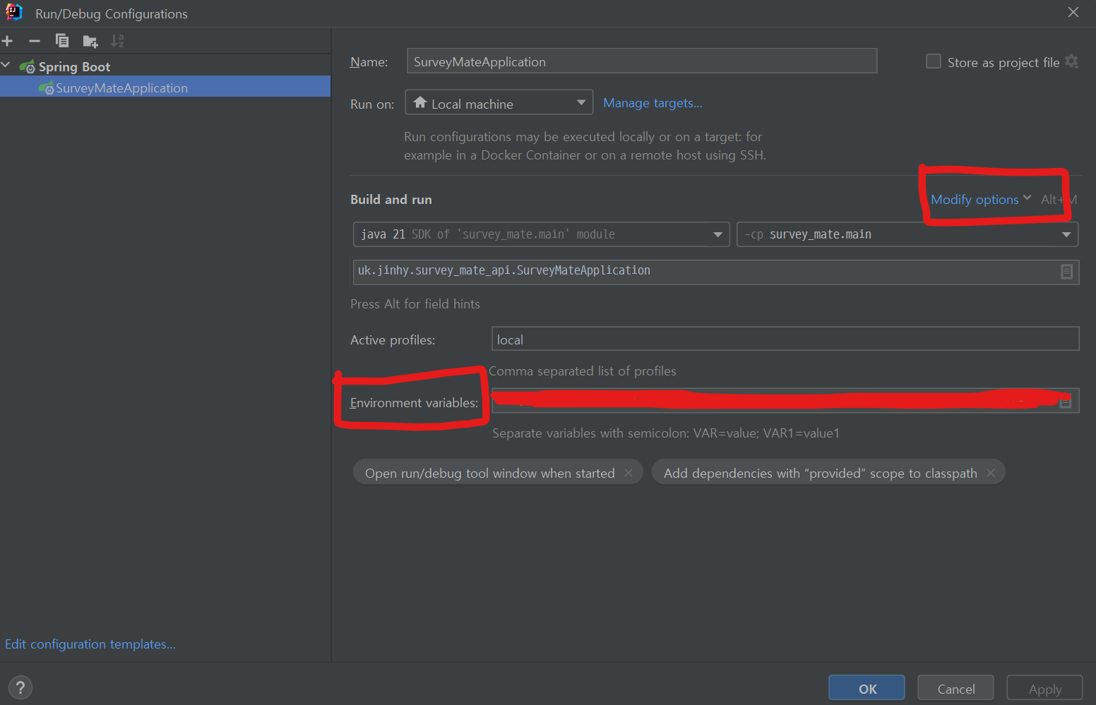 인텔리제이에서 오른쪽 위에 edit configurations에 들어가서 내 어플리케이션의 환경변수 설정을 잘 해주자. 처음에 environment variables 부분이 없어서 당황했는데 modify options 눌러서 environment variables 선택해주면 된다.