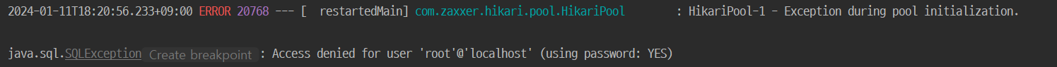 밑에 접근 거부멘트를 보고 해결법을 유추했는데 using password: YES인 경우 mysql에서 비밀번호가 틀렸을 때 나오는 상황이다. 그래서 mysql 비밀번호를 어디서 설정하더라? 아까 DB connection에서는 잘 됐는데 하다가 스프링부트 내의 환경변수에서도 mysql 비밀번호를 사용하는게 생각이 나서 확인해보았다.