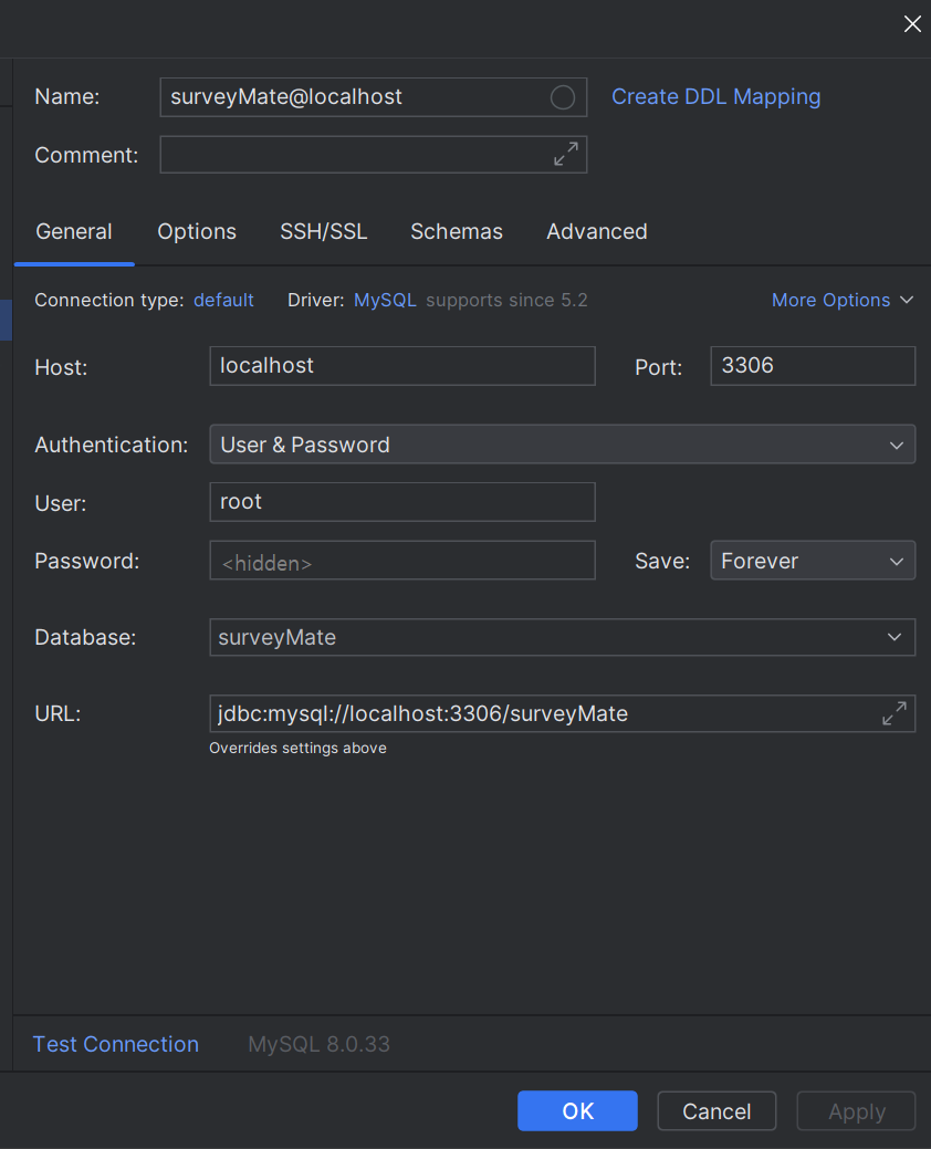 create database surveyMate로 DB 만들어주고