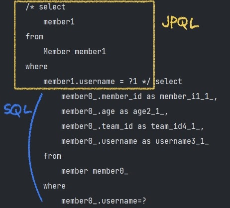 JPQL에서 Member 엔티티 별칭이 member1로 설정된 것을 확인할 수 있다.