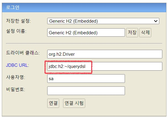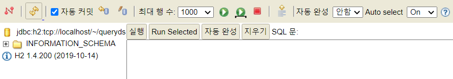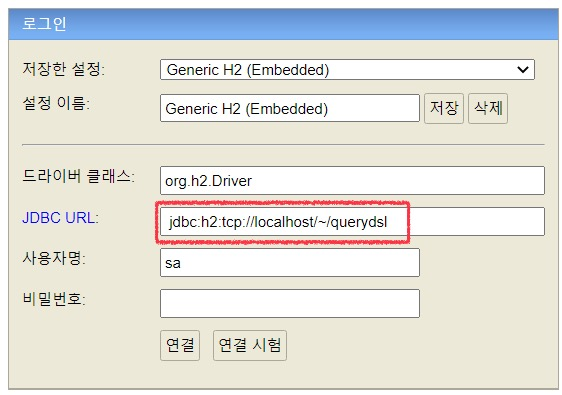 JDBC URL : jdbc:h2:tcp://localhost/~/[db명]
