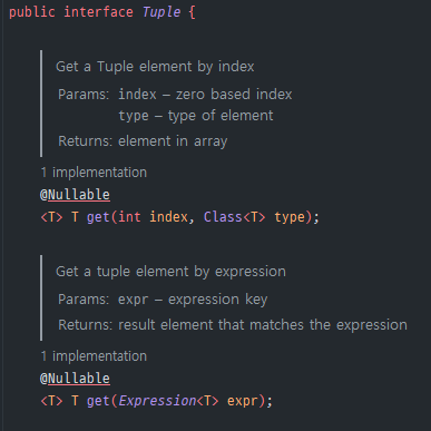 Tuple tuple = result.get(0); // tuple 리스트에서 tuple 꺼내오고
