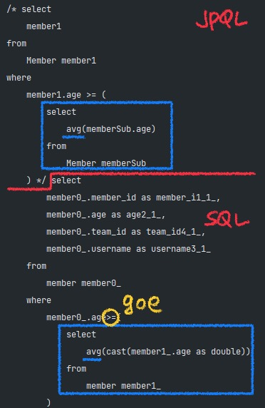 .where(member.age.goe( // 메인 쿼리: 멤버의 나이가 평균값보다 크거나 같은 멤버 조회
