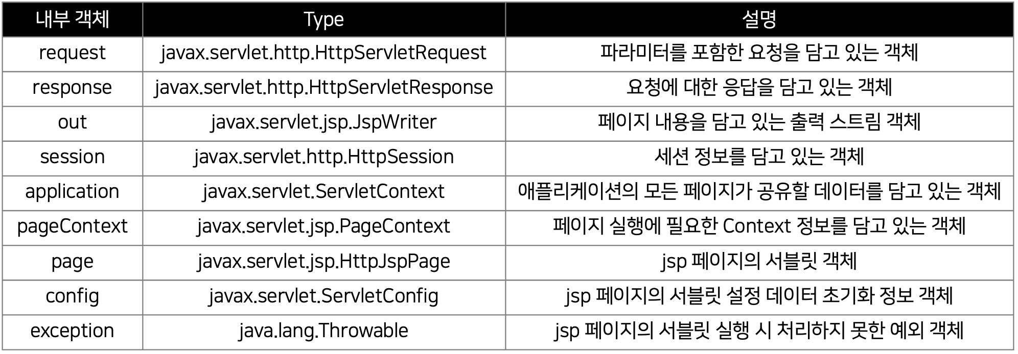 jsp 페이지를 작성할 때 특별한 기능을 제공하는 객체로, JSP 컨테이너가 제공함
