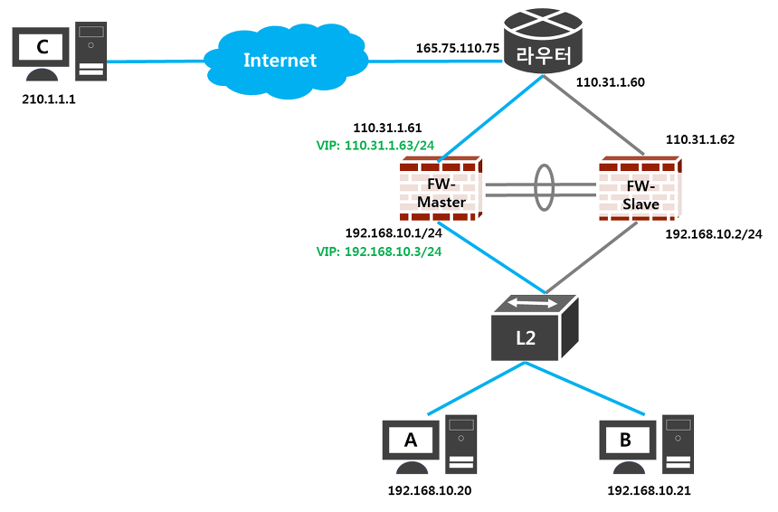 방화벽이 그림과 같이 두 대로 이중화 되어 있다면(FW-Master, FW-Slave), 라우터는 어느 방화벽이 Active인지 모름