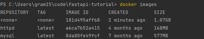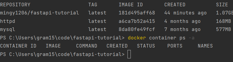 분리 모드(-d)의 fastapi-tutorial이미지에서 새 컨테이너를 시작한다. -p 로 포트 매핑을 설정할 수 있다. -p 3000:8080이라고 기술하면 처음 3000 현재 로컬 컴퓨터의 포트이고 콜론(:)다음의 8080은 앱이 컨테이너에서 수신 대기하는 포트다.