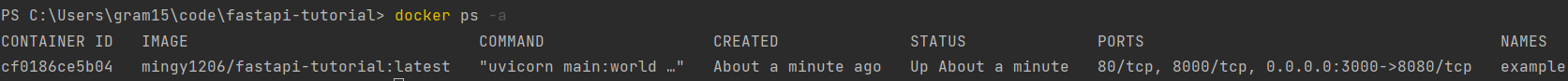docker run -d -p 3000:8080 fastapi-tutorial:latest