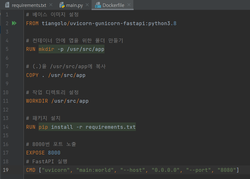 Dockerfile을 작성해준다.(트러블 슈팅이라고 할 것까지는 아니지만, fastapi는 서버 실행을 위한 cmd실행을 dockerfile에 작성해주어야하고, 연습삼아 FastAPI 객체의 이름을 world로 했다가 시간을 너무 잡아 먹었다. 다들 조심하기를,,,,)