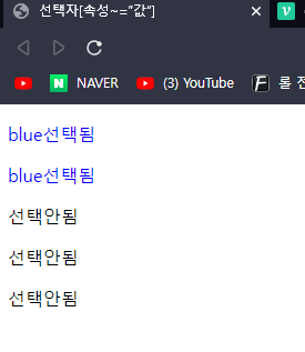 | 선택자[속성*=“값”] | 선택된 태그 중 속성의 값에 포함되어 있을때 선택됨. |