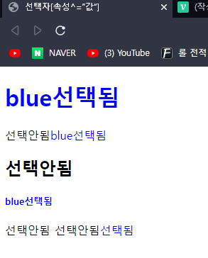 | 선택자[속성^="값"] | 선택된 태그 중 속성의 값으로 시작하면 선택됨. |