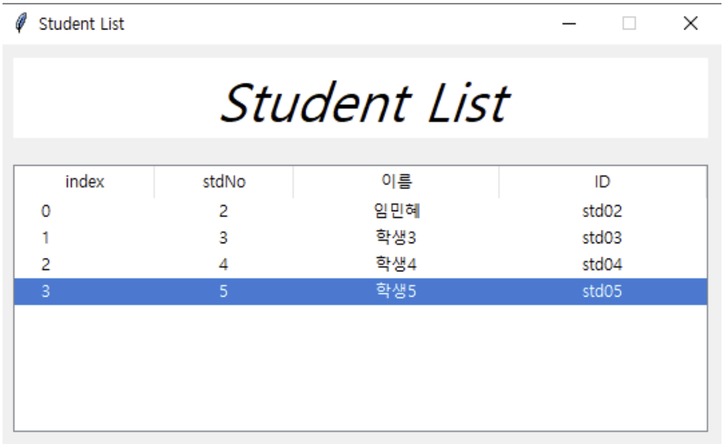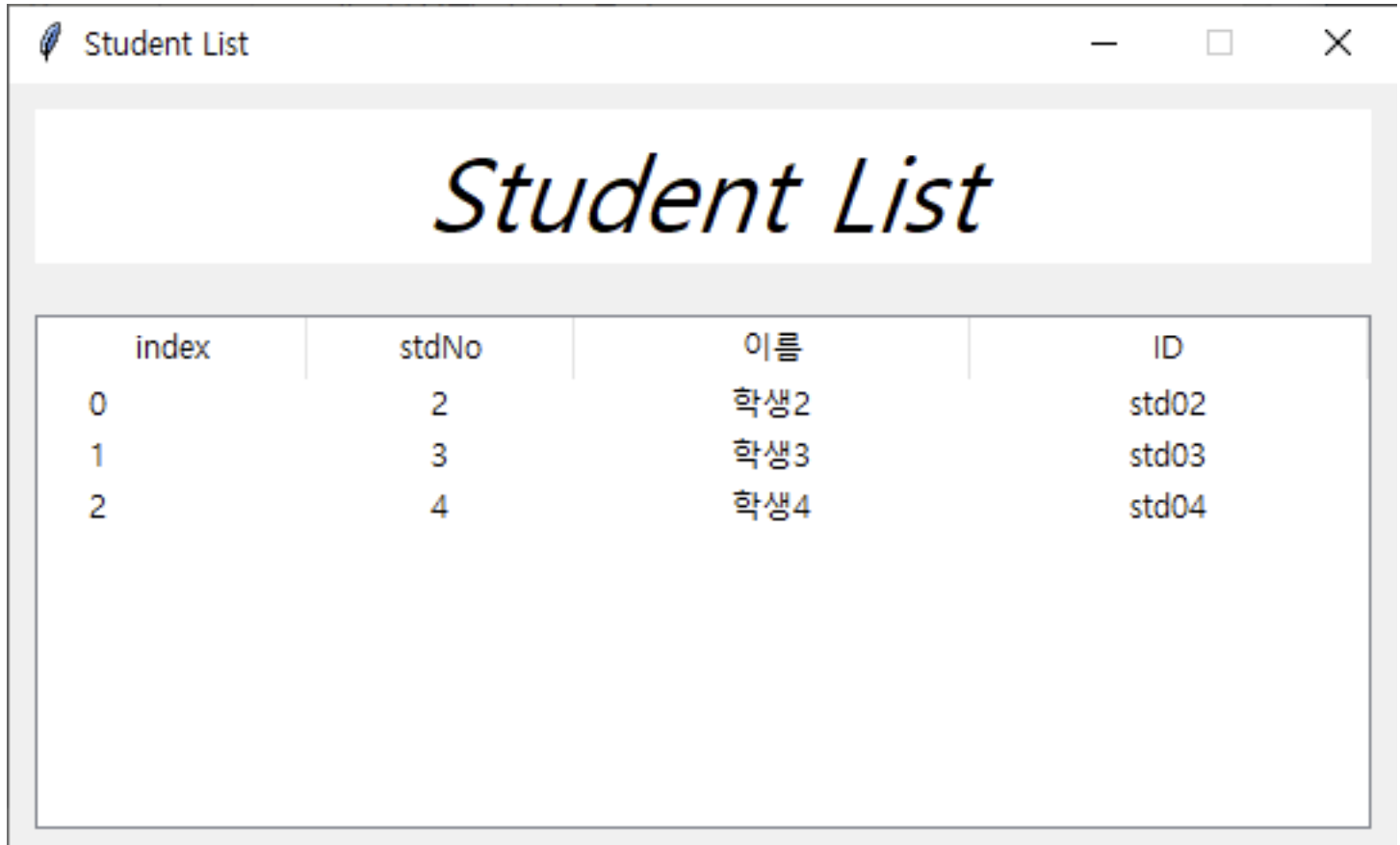 ▼ 알맞은 ID, Paswword 입력 후 Login 버튼 클릭시 Student List창 실행