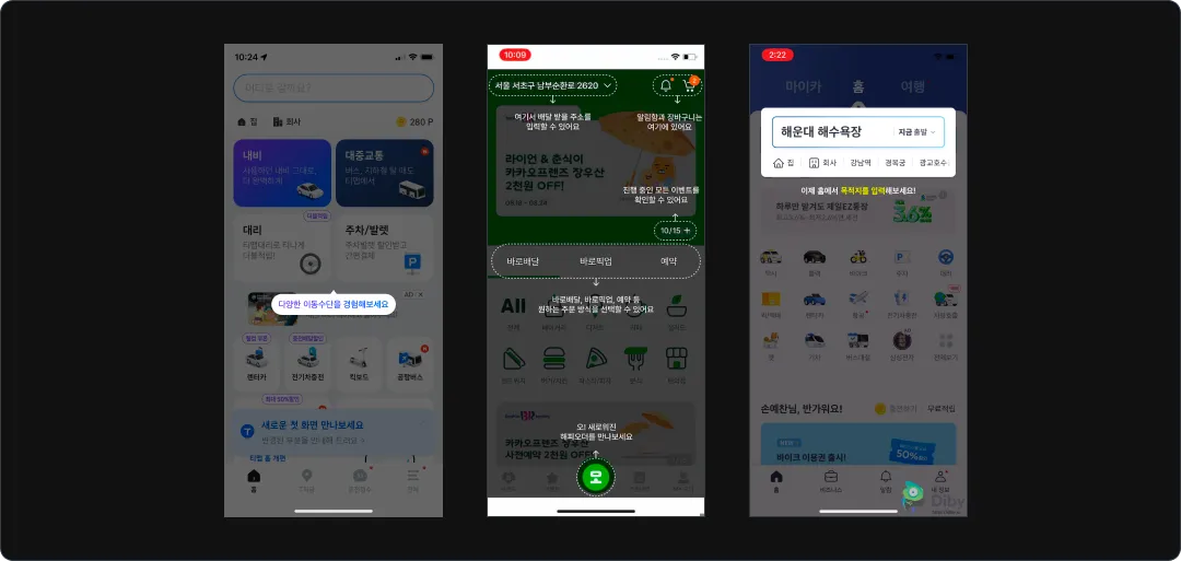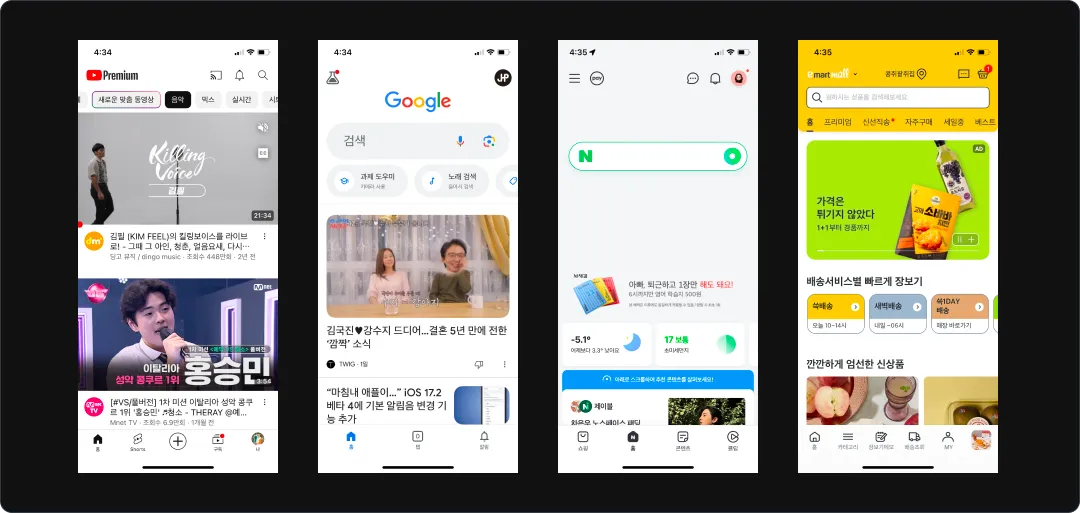 제품에서 차지하는 검색의 중요도에 따라 검색 기능의 위계가 다른 것에 주목. 돋보기 모양의 아이콘으로만 배치한 제품도 있지만, 화면에서 검색창을 아주 크게 전면에 표시한 제품도 있음. (유튜브는 영상 중심이라 영상이 더 큰데, 네이버나 구글은 사용자가 검색을 많이 하니까 검색 영역이 더 큼.)