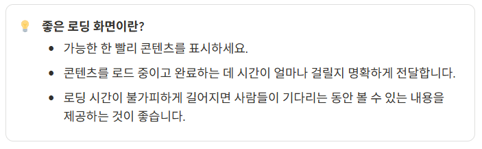 단, 스켈레톤이 실제 화면의 로드를 방해하는 주객전도의 상황(이걸 만드는데 더 큰 로딩이 생기는 것...)이 생기지 않도록 주의하자. 가능한 가장 단순한 모습의 회색 박스를 사용하여 불러오는 페이지를 예측할 수 있는 형태로 표현하는 것이 좋다.